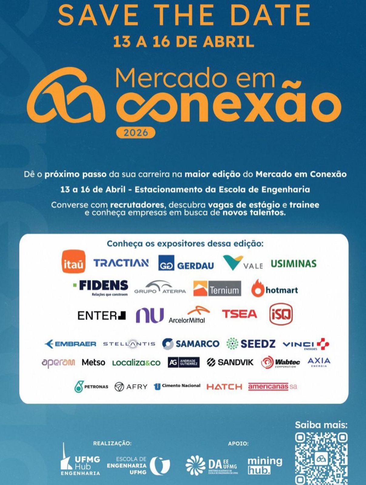 Entre os dias 13 e 16 de abril, acontece o evento Mercado em Conexão 2026 no estacionamento da Escola de Engenharia da UFMG, reunindo estudantes e grandes empresas por meio de palestras, networking e contato com recrutadores.